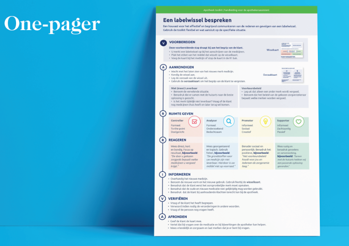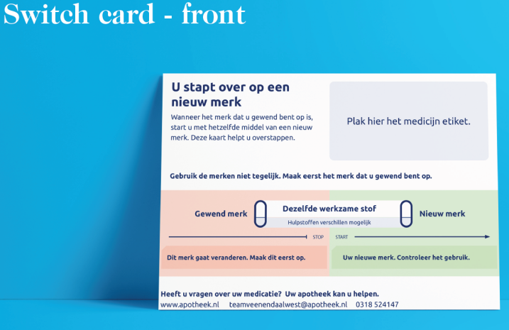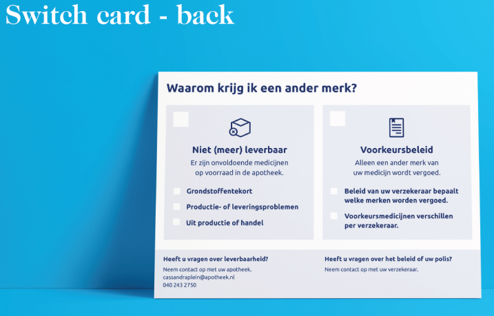 As stated in the introduction, the first result of the project is a toolkit for pharmacists that describes the best way to carry out the conversation at the counter: the first time it becomes clear for a patient that a medicine switch has occurred for him/her. It also includes visual aids for the patient, that help him/her to understand the complex and confusing situation. This result has been created through different rounds of iterations: after internal discussions, two separate focus groups and two separate pilots.