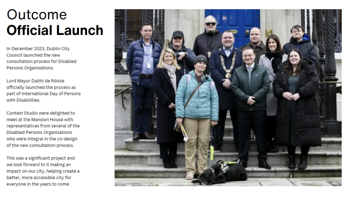 In 2022/23, Context Studio collaborated with Dublin City Council (DCC) and various Disabled Persons Organisations (DPOs) to co-design a new consultation process for disabled persons organisations. Under the United Nations Convention on the Rights of Persons with Disabilities these organisations must be consulted by the city as a matter of priority on decisions which impact their lives.
