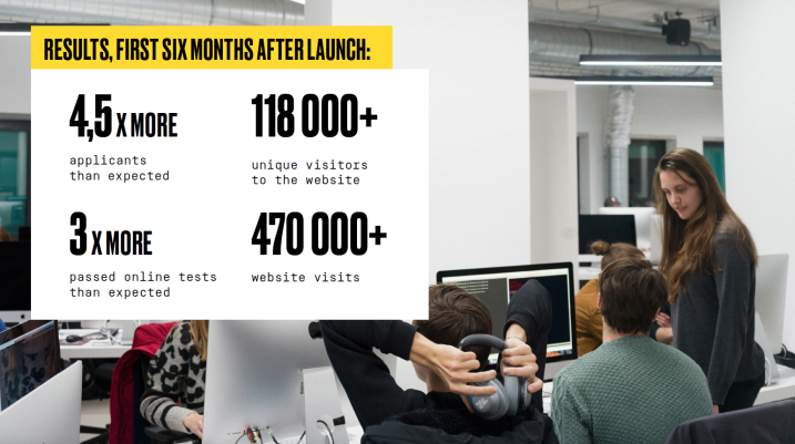 One week after the launch of the school in December 2018, 45 % of the core target group (brand awareness market research, 16–30 years old, n= 1000) had heard about the coding school, and 48 % of the core target group said they would consider applying to the school. 42% of women considered applying.