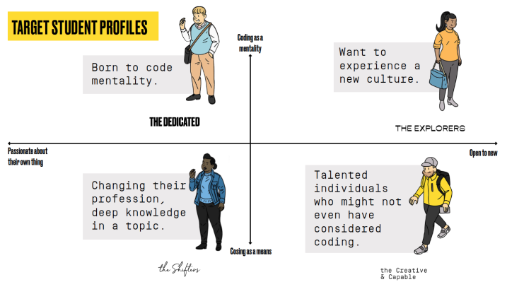 We then segmented and built four target group profiles for potential students based on two motives for applying to study coding. Some had a higher level of openness to try new areas of expertise than others who were already more focused on what they knew best.