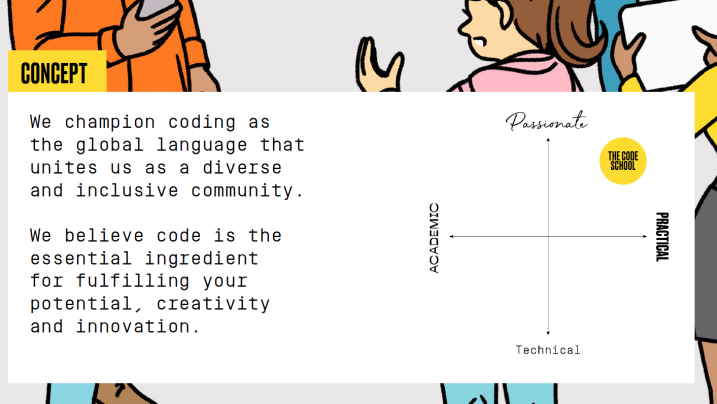 Whereas other coding schools projected an academic or technical approach, we designed the new school's experience concept around the creation of an inclusive community that uses code as its global language, and as the ingredient to fulfill one's potential and passion.