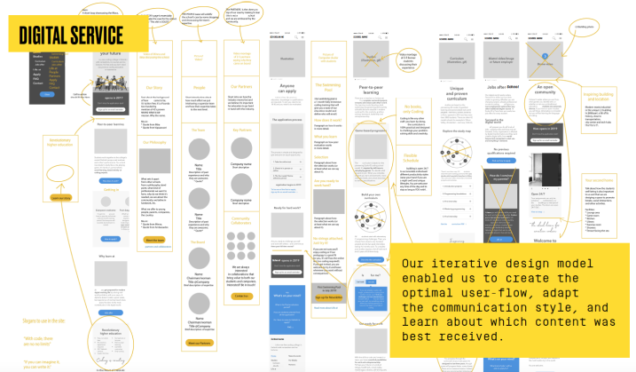 We were chosen to lead this massive service-design project: crafting an insight-driven customer experience concept for the school, designing and building its identity and digital presence, and creating the spatial concept for the physical building. The school opens its doors to students for the first time in the fall 2019 and the objective for the first year was to receive at least 2 000 applications – both from Finland and from abroad.