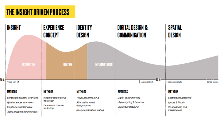 The output of the insight-based customer experience concept has been executed in an omnichannel manner, the main design outputs being the school's tone of voice, visual identity, digital services, and physical space.
