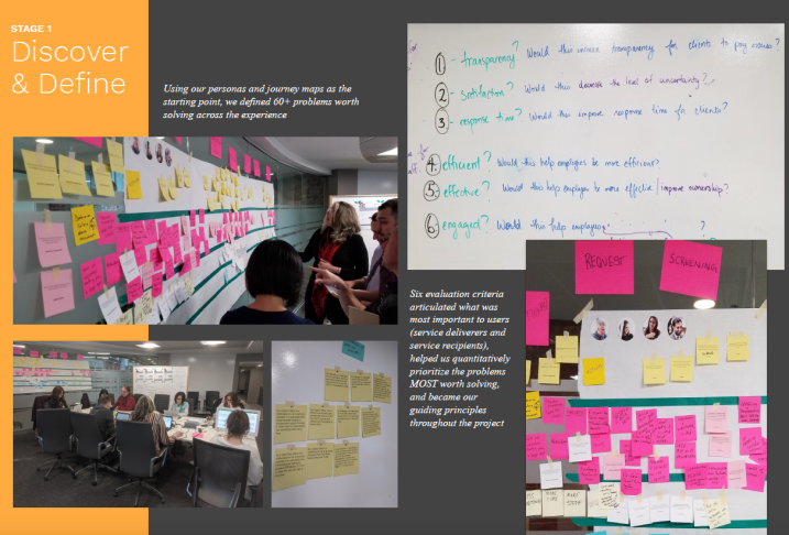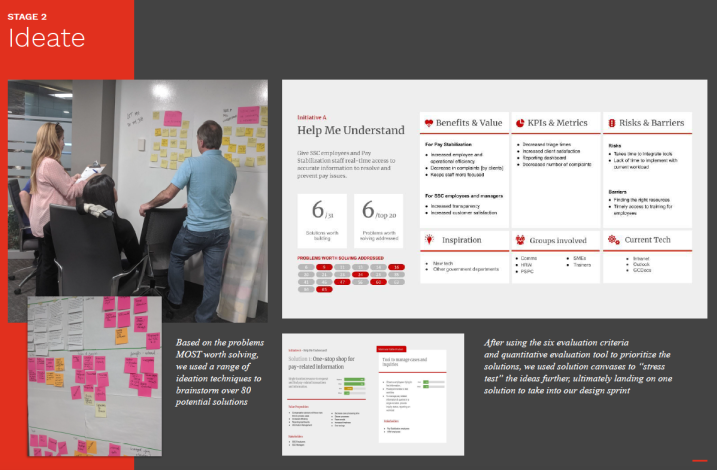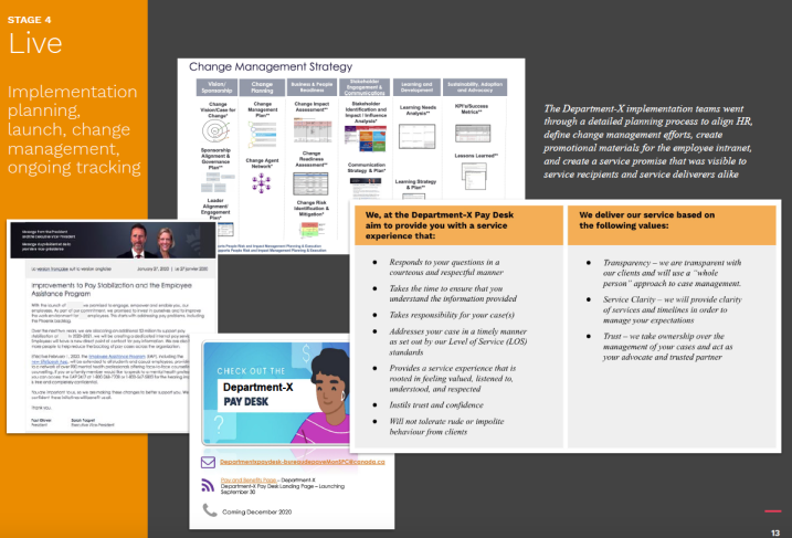 The detailed outputs outlined above were simply the starting point. The real magic happened in implementation, when the prototypes and sample materials came to life. In our visual document we’ve included images and artifacts from the new Pay Service Desk in action – what clients are experiencing today. The implementation of this new service also included extensive planning, change management, employee training, and communications.