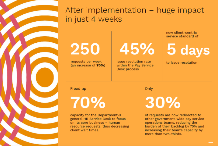 Only 30% of requests are now escalated to other government-wide pay operations teams, reducing the burden of their backlogs by 70% and increasing their teams’ capacity by more than two-thirds (to deal with pay issues from other departments). In addition, the calls relating to pay issues that were previously routing through the general HR Service Desk (accounting for nearly 70% of its call intake) are now routed directly to the new Pay Service Desk. Not only has this reduced handover times and wait times for clients it has also created 70% more capacity for the general HR Service Desk to focus on its core business – human resource requests.