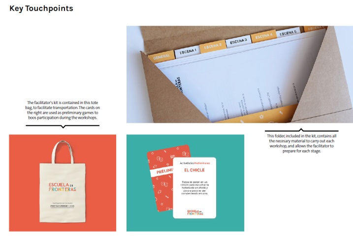 A key touchpoint designed for this service was the facilitators kit, a tote bag that included the script and materials for each session. The kit also included preliminary activities and assessment cards, that allowed monitors to introduce and close every workshop. Another important keypoint