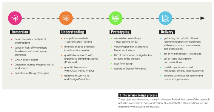 The solution was designed for inhabitants of bigger cities with Paris as the first location. Our main objective was to implement the experience strategy that would make it more human, fast, and easy to use. Key metrics we wanted to influence were the average duration of the pick-up process, satisfaction with a service (measured with CSAT), and percentage of returning customers.
