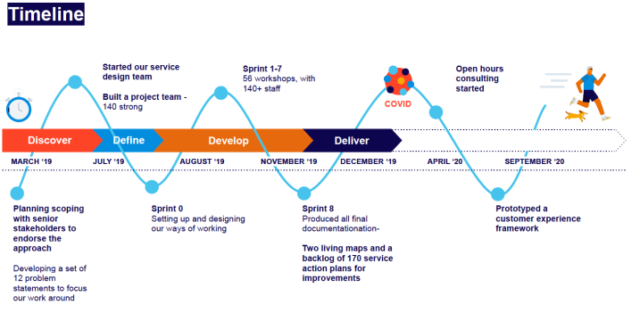 Originally we set out with two goals: to map the entire customer and staff experience, and determine how to work as a service design team 100% remote. What we ultimately achieved was well beyond that. We started from a groundswell of shifting mindset where teams were focused on project delivery, and moved to an experience-led delivery where staff are thinking about the experiences they create. We have piqued the interest of 140+ staff in understanding the value of having a holistic and tangible way to understand and communicate our customer's current experience.