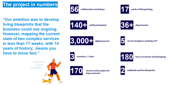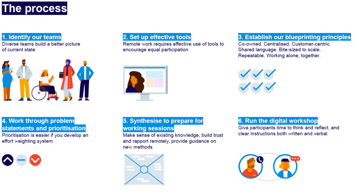 Our ambition was to develop living blueprints that the business could use ongoing. Mapping the current state of two complex services in 17 weeks means you have to move fast. Our process encompassed six steps: