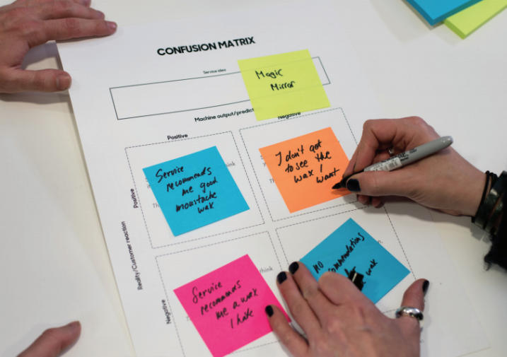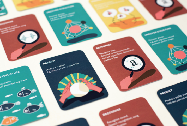 Non-tech experts felt it was easy to approach a complex topic, when using tangible paper tools. Cards helped with categorising different functions in a more memorable way. The illustrations made difficult topics easier to remember and more likable. For example explaining machine learning bias in the form of an illustrated bug, who comes to visit was considered humorous. The canvases helped mapping out complex topics such as a confusion matrix in an easy and fun way which was still useful from data science point of view: the terms remained the same.