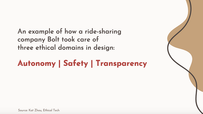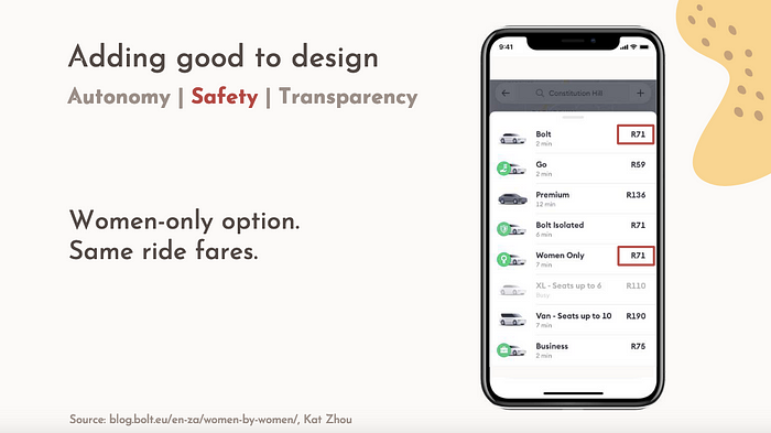Bolt is also reportedly the first service to introduce women-only ride-share options — their case study of South Africa is an example of contextual ethical design. Of course, this type of segmentation can open up unknown layers of various ethical concerns in alternate cultures.