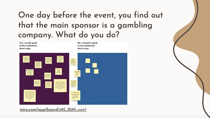 True story. You get an invitation to speak at the conference on the topic you find meaningful. One day before the event, you find out that the main sponsor is a gambling company. What do you do? Would you speak at the conference? And why? Or would you choose not to talk at the conference? And why not?