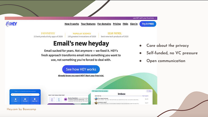 (2) Another example is HEY (a new email service from Basecamp), primarily used in Europe. HEY claims good ethical design by caring about your privacy while at the same token taking a neutral stance on politicizing ethics with privacy — “we don’t have to solve deep social problems, chime in publicly whenever the world requests our opinion on the major issues of the day, or get behind one movement or another with time or treasure.”
