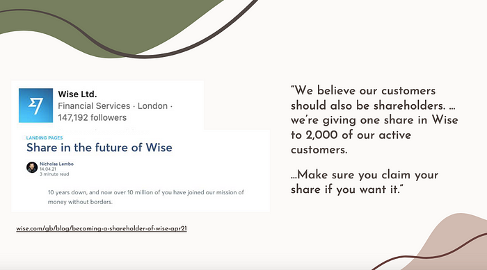 (3) A third example is Wise Ltd. A virtual (global) banking card. Wise believes their customers should also be shareholders. Digital currency, money, with moral values.