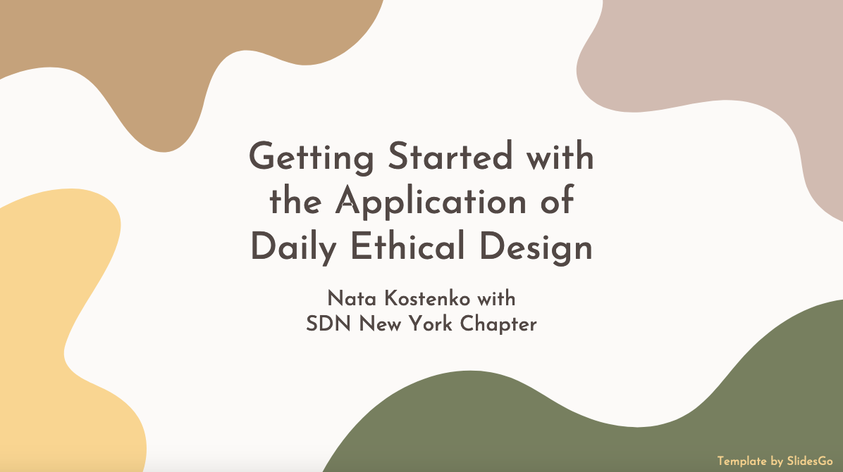 On Tuesday, August 10th, the SDN New York Chapter was delighted to host service designer & researcher Nata Kostenko, design ethics enthusiast, former digital nomad, to talk about the exciting possibilities for a relatively new area in service design, Ethical Design. While the discipline is still in its nascent stages, Nata shared some examples of successful and not-so-successful uses of the practice of how businesses, products, and services that are looking to build from principles of fairness, diversity, and fundamental integrity towards product design and human-centered design might use “ethics” to engage their customers deeper.