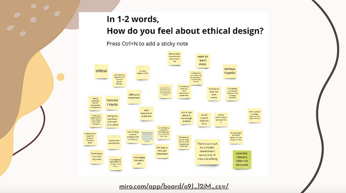 Participant replies from the Miro prompt on (3) “Ethics depend on many viewpoints being considered…” “Take small steps (towards responsibility).” “Hiring someone full-time (Chief Ethics Officer).” “Create a Slack group, posting about ethical vacancies, like ethical tech, ethical developers, data scientists…” “In a perfect world, there will be no need for ethical….”