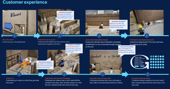 The project aimed to revamp the donation and purchase processes at Goodwill, introducing a new service flow that connects donors and customers through story cards. These cards convey the narratives behind second-hand items, enriching the meaningful and enjoyable experiences of donation and purchase. The initiative sought to optimise Goodwill's second hand sales chain to better support its charitable services within the community.