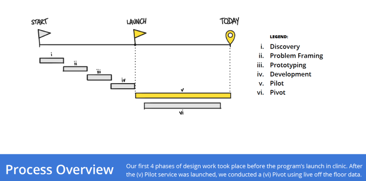 Our team carried out a 6 phase design process: (i) discovery (ii) problem framing (iii) prototyping (iv) development (v) pilot and (vi) pivot. This process immersed us into the lives of people grappling with this chronic deteriorating condition, it gave us exposure into a world-renowned cardiac clinic constantly abuzz with clinicians, patients, and families, and it saw us continuously iterate on an HF service until we were confident we had designed one that would not only stick, but that would transform the delivery of care.