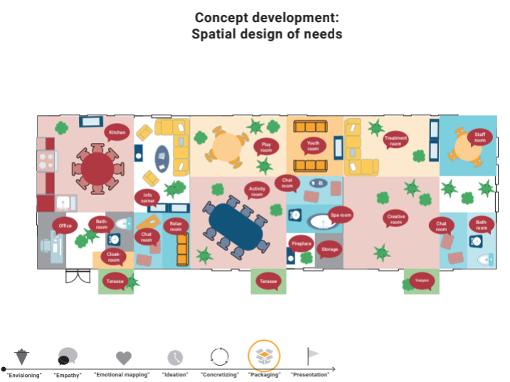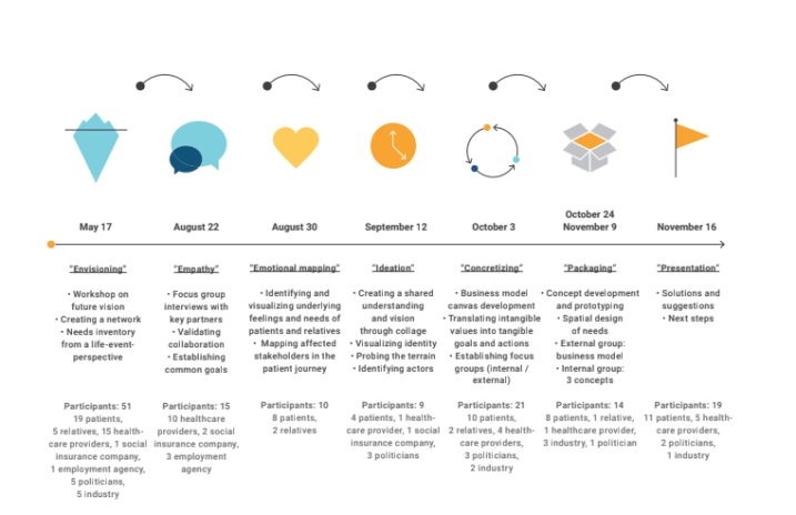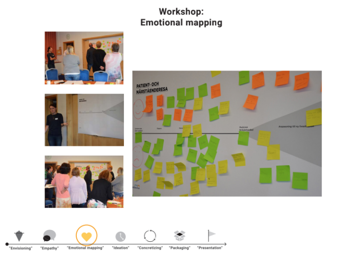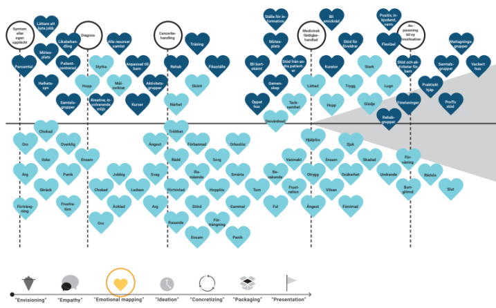 Without such support, finding one’s new identity and way back to everyday life is difficult. In addition, the risk for relatives to fall sick due to stress caused by the disease increases by 25 percent one year after the diagnosis (Sjövall, 2011). Not only does a cancer diagnosis affect patients and relatives, but also colleagues at work, healthcare providers, social insurance agency, employers, school, etc. The social welfare system alone will not be able to tackle this challenge. Therefore, we need to think in new paths about how public and private resources can be integrated better to provide support for cancer-affected, in a holistic way. In this innovative design project, the gaps between the involved stakeholders in a cancer patient’s rehabilitation journey were identified and all of the actors were invited to participate in a collaborative service design project with the aim to design better-integrated solutions beneficial for both cancer-affected and all stakeholders.