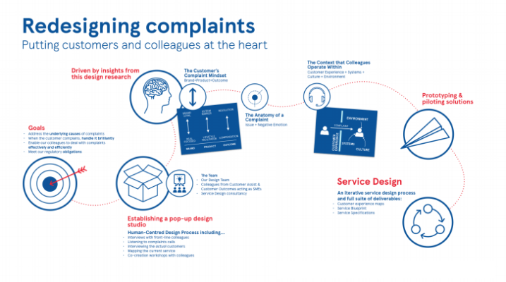 Check: The bank’s team listened to over 400 customer complaints calls, identifying the root cause of each complaint and understanding the context and origin of the customer’s complaint. They analysed the Bank’s processes for handling complaints, using complaint data to measure the effort taken in each step and the variance between outcomes. This process fed into the current state service blueprint.