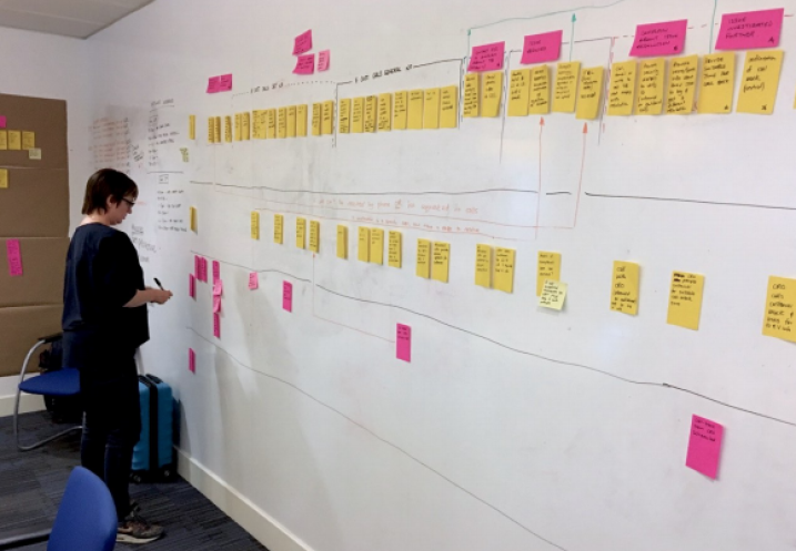 Current-state service blueprint: We wanted to take a thorough and detailed look at the current service. We built on the Check process to create a working service blueprint of the current complaint experience. The process was fast: working from the existing process maps meant that we could create a service blueprint in a matter of days.