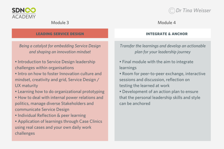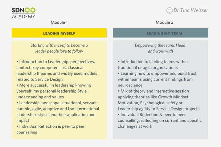 Nowadays, leading (service design) teams is a very responsible and demanding task in both traditional and agile organisations. This two-month learning journey is designed to support current or prospective leaders in managing their broad range of daily tasks. The course aims to enhance your leadership skills holistically, addressing these three dimensions: leading yourself, leading your team, and leading the organisation.