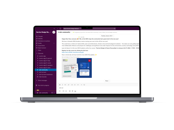 The service design community is becoming larger every day. We are very excited for the discipline to grow, because we truly believe that service design is the key to future social and economic success. To better connect the more than 30.000 people that already follow SDN's activities, we’re pleased to launch the official SDN Community workspace on Slack. It is open to both paid members of the SDN, as well as our community followers and the wider service design community. Join today – it’s free!