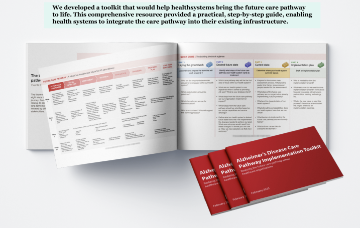 Directed at health system leaders, the Implementation Toolkit provides guidance and tactics for healthcare organizations as they work to make the care pathway a reality. It consists of several components, including 1) A future state care pathway for Alzheimer’s Disease, 2) A four-step implementation framework, 3) Common barriers and enablers to care pathway implementation, and 4) Supporting tools to guide implementation efforts in healthcare organizations.