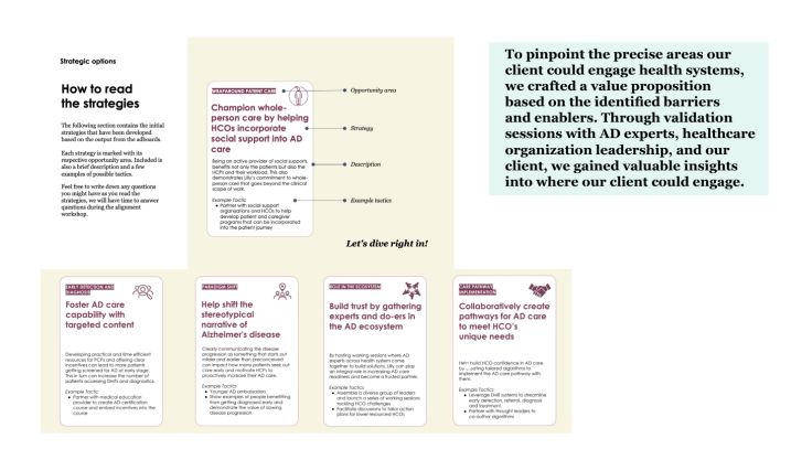 We partnered alongside a pharmaceutical company working in the Alzheimer’s Disease space that was seeking to work with their health system partners as they prepare to increase their readiness to deliver Alzheimer’s Disease care. Together we were tasked with finding ways to support healthcare organizations that need to build better care pathways for Alzheimer's Disease in anticipation of emerging treatment options.