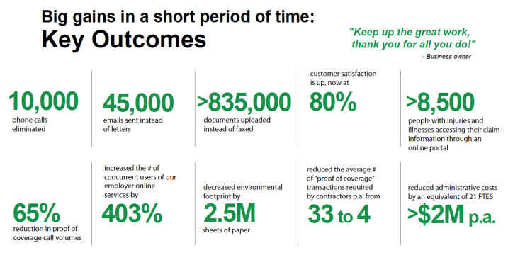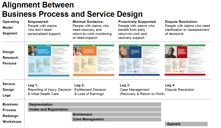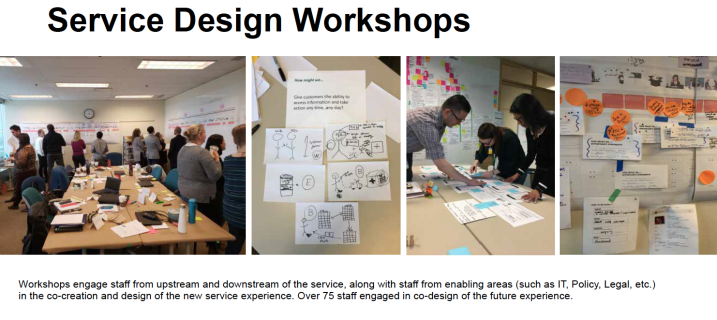 Assessments on the future service design were completed by the Legal, Policy, Compliance, IT, Change Management, Data, and Finance teams, most of whom had been workshop participants. This ensured that the proposed journeys met all legislative requirements, and enabled those areas to bring forth any concerns. The assessments also eliminated organizational silos, increased transparency and buy-in, and extended co-creation opportunities to more “rules” centric teams. The future service experience, along with the assessments, was then presented to C-Suite executives for approval.