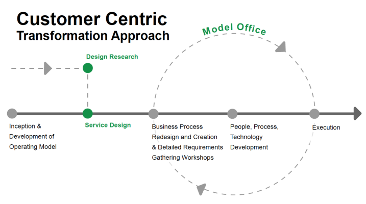 A Model Office was also set up as a working prototype of the future service experience. Model Office integrates the people, process and technology elements across frontstage and backstage touchpoints, iteratively testing them against real research-based scenarios within a simulated work environment.