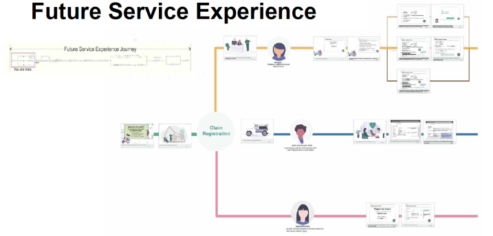 Following the conclusion of the service design work, a consolidated end-to-end journey map was created that merged steps from each phase (“leg”) of the service experience to display the future service design from the beginning to end of a claim. This map is now used as a North Star for the organization, and acts as a single source of truth. It continues to drive a shared understanding of the vision for the future.